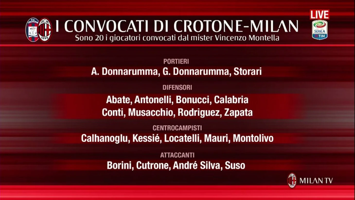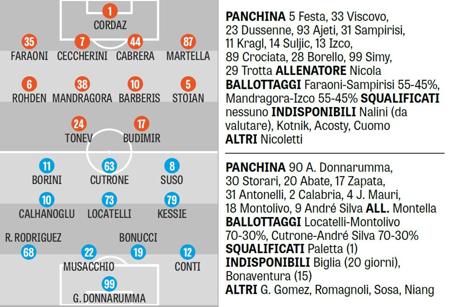 Место разразившегося дублем Риккардо Монтоливо в старте должен занять не имевший игровой практики на текущей неделе Мануэль Локателли. Чалханоглу безальтернативно начнет игру в старте на левом фланге полузащиты в связи с повреждением бедра Джакомо Бонавентуры.