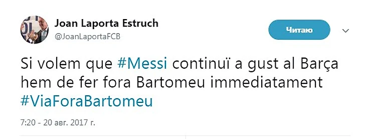 "Если мы хотим сохранить Месси, Бартомеу должен уйти немедленно" - написал бывший президент "Барселоны" Жоан Лапорта в Твиттере.