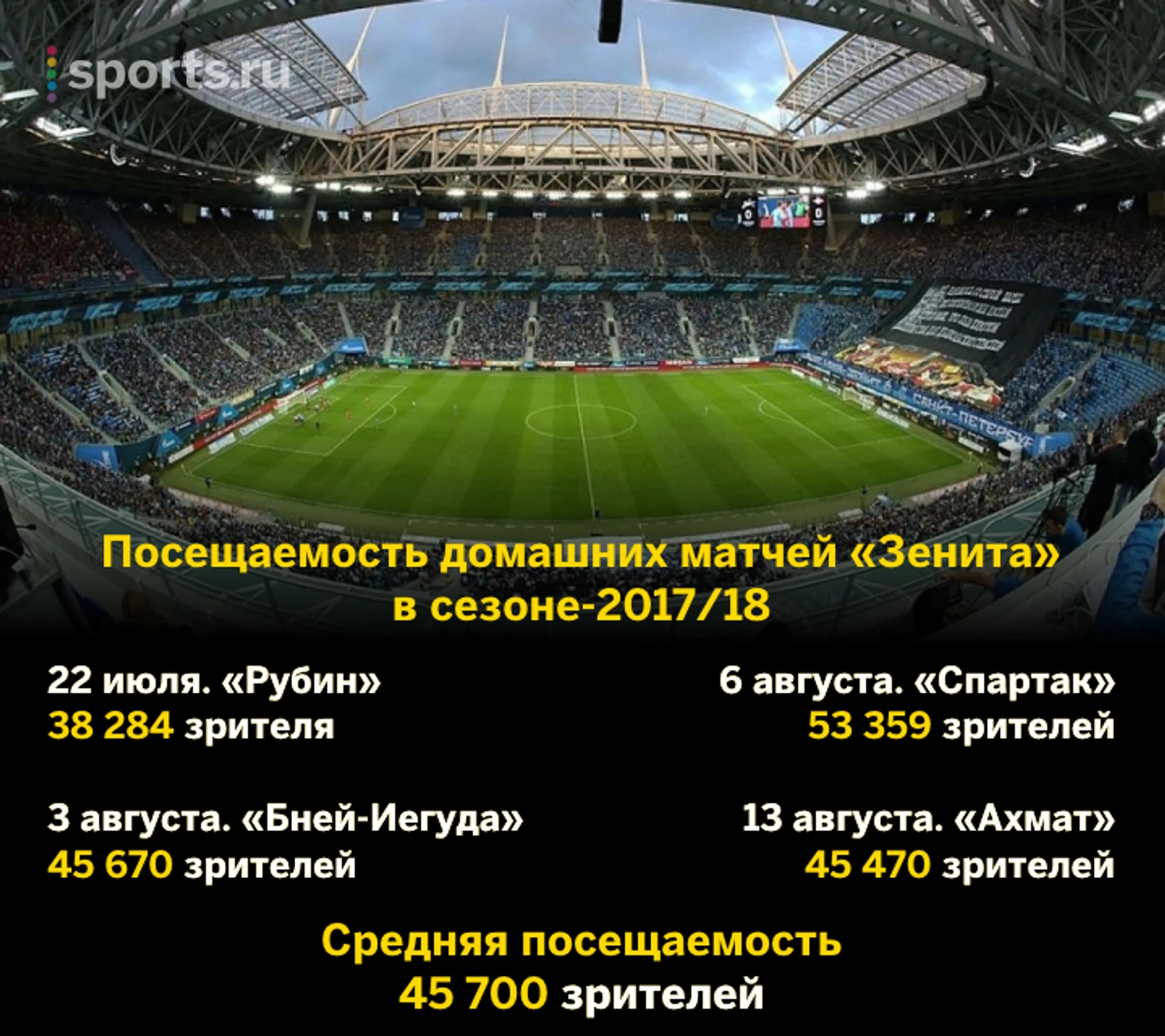 В этом сезоне «Зенит» уже дважды побил свой рекорд по посещаемости. В первый раз это случилось на матче с «Бней Иегудой». Во второй – на дерби со «Спартаком».