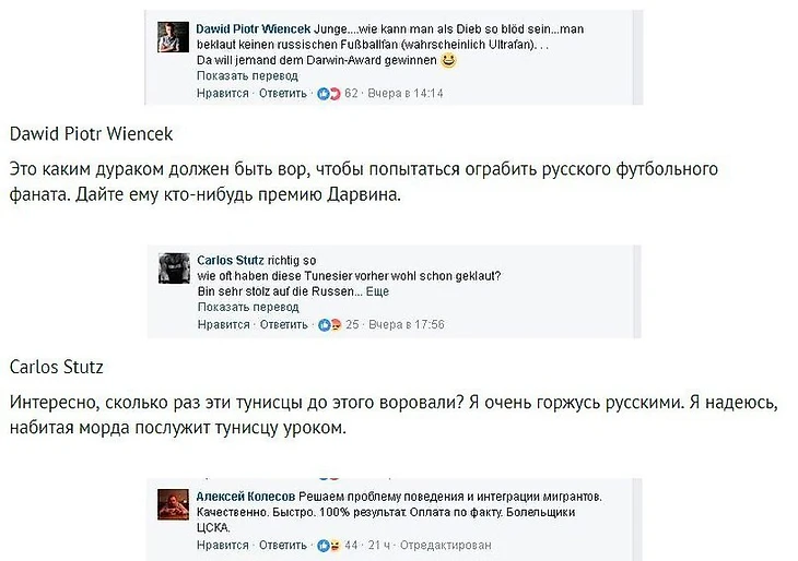 Комментарии европейцев к новости о фанатах ЦСКА, избивших мигрантов, которые пытались стащить кошелёк