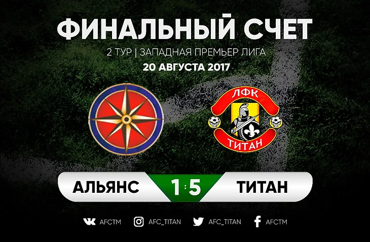 В минувшие выходные состоялись восемь матчей 2-го тура Западной Премьер-Лиги ЛФЛ. В одной из воскресных встреч на поле вышли и подопечные Владимира Короткова, которым предстояло сыграть с хорошо знакомым по прошлому сезону коллективом «Альянс». В стартовом составе «чёрно-зелёных» произошла лишь одна перестановка по сравнению с предыдущим удачным матчем против «Мегатитана» – Артём Фролов в «старте» заменил Дмитрия Кудинова, расположившись на правом фланге обороны. Именно Фролов в первой же осмысленной атаке «Титана» имел возможность открыть счёт в матче, но Александр Егоров справился с его ударом, а после эффектного добивания Алексея Медведева мяч прошёл в считанных сантиметрах от штанги. «Искатели» в течении трёх следующих минут ответили на это опасным ударом со штрафного, в исполнении Фёдора Зинченко, и выходом Евгения Дроздова на рандеву с Юрием Костриковым. Но, стоит отдать должное, голкиперу «чёрно-зелёных», который в обоих эпизодах сыграл надёжно и выручил свою команду. Забегая вперёд скажем, что под занавес первого тайма стражу ворот «Титана» также удалось отразить удар с десятиметровой отметки, в исполнении всё того же Дроздова. Это всё, что удалось создать «красно-синим» у чужих ворот в первой половине встречи. «Титан» же владел преимуществом, разнообразно атаковал и играл с большим желанием победить. Всё это вылилось в два гола, которые были забиты после стандартных положений у ворот Егорова. Счёт в матче был открыт на девятнадцатой минуте после розыгрыша углового, который завершился мощным выстрелом Дмитрия Лушникова с радиуса штрафной площади. А спустя три минуты «титаны» удвоили своё преимущество. Виктор Капков хлёстко низом пробил со штрафного, а Медведев, располагавшийся на линии вратарской, аккуратно подправил мяч в сетку. Также в первой тридцатиминутке можно отметить удар Артёма Кузина с дальней дистанции, который приняла на себя перекладина ворот «Альянса», оставив тем надежду на спасение.