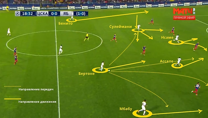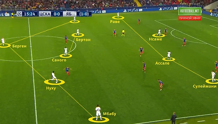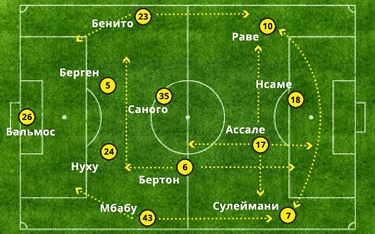 В защите на фланге слева играл Бенито, а фон Берген в центре защиты. Далее Бертон, который никогда не являлся вингером и быть им не может. В матче он исполнял роль оттянутого плеймекера, на позиции опорного полузащитника и в первом тайме все атаки строились, преимущественно, через него. Саного никак не нападающий, он типичный опорник. Говоря языком футбольного менеджера – мощный опорный полузащитник. Далее все, в принципе, более менее логично. На острие Нсаме вместо Оаро. Ниже Асселе, Сулеймани и Раве, которые менялись позициями.
