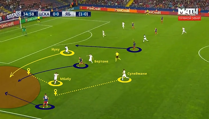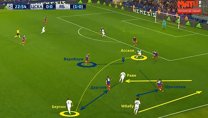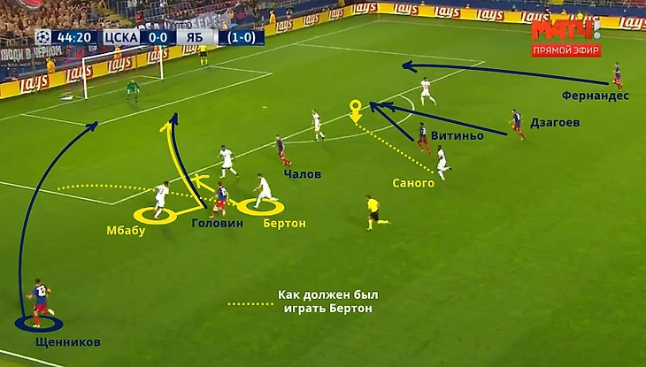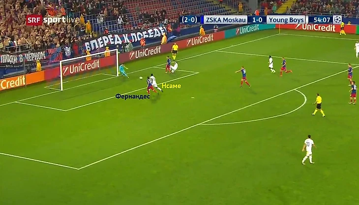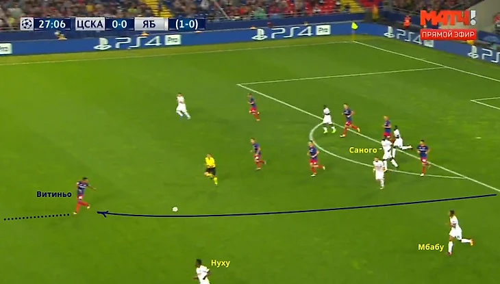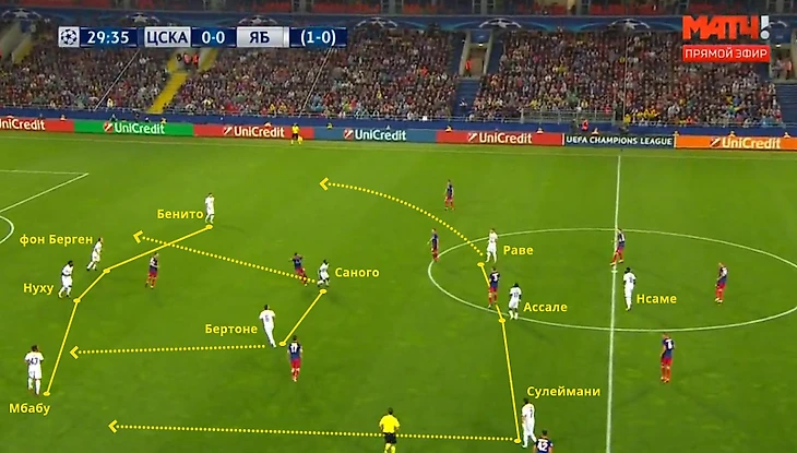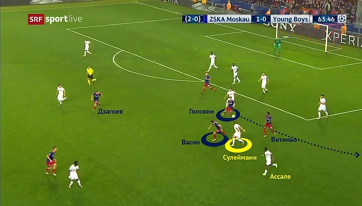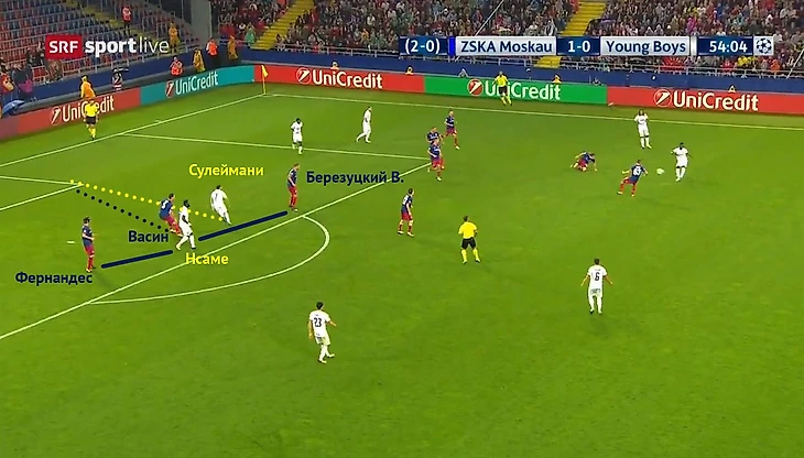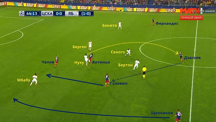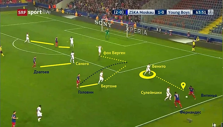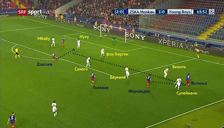 Показательный момент, когда фулбеками ЦСКА занимались фланговые защитники, при этом за их спиной открывалась большая зона. Этой зоной с удовольствием пользовались Дзагоев, Витиньо или Головин, редко Чалов. В одном из таких моментов Нуху последовал за Дзагоевым, а за центрдефом Янг Бойз образовывалась зона, в которую мог открываться Витиньо. И так раз за разом, как состав поезда оборона Янг Бойз стягивалась в одну сторону, что создавало огромные дыры. Ощутимая недоработка в оборонительных рядах раз за разом выливалась в опасные моменты.