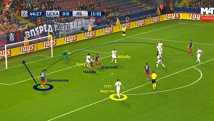 Вторым темпом их поддерживали Дзагоев, Фернанес и реже Щенников. Кстати, в этой контратаке не хватило немного опыта Бертоне. Витиньо был ещё в центре поля и лететь к нему сломя голову не стоило. Тем более, что Нуху никак не успевал закрыть правый фланг защиты. Это только наоборот спровоцировало передачу в свободную зону на Головина.