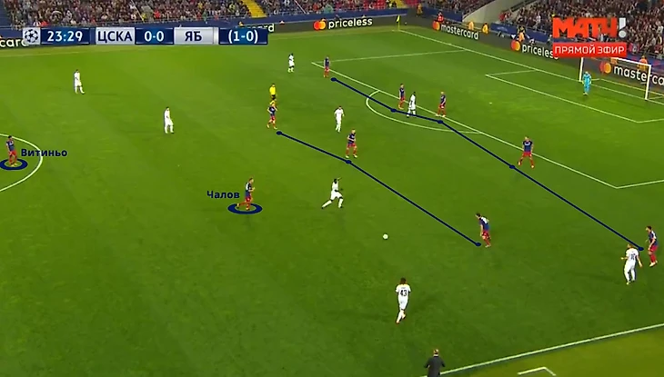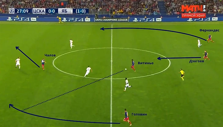 По ситуации к передней линии подключался Чалов или Витиньо. При этом обязательно один игрок создавал глубину для контратаки, находят ближе к центральному кругу – Чалов чаще, Витиньо реже. Ему сразу направлялся первый пас. Контратаку тут же поддерживали так же Дзагоев и Головин. Так, к слову, получился выход один в один у Головина.