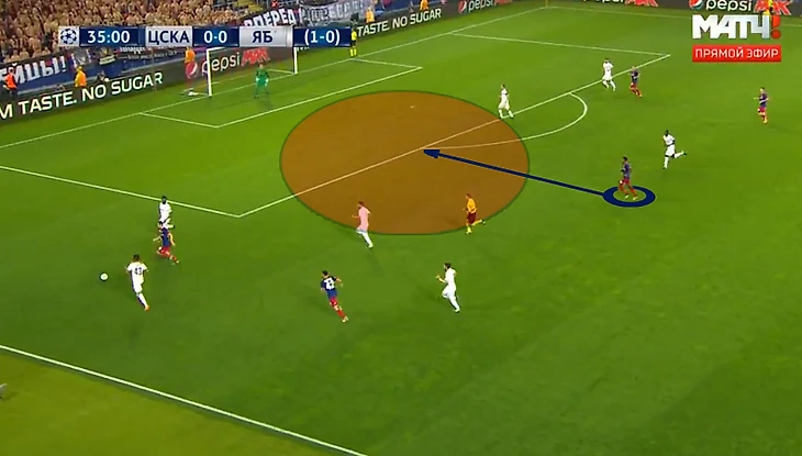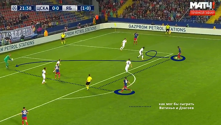 При атаке через фланг Дзагоев зачастую находился в районе полукруга, ожидая передачу под удар. Кстати, стоит отметить, что Витиньо очень часто перетягивал на себя одеяло и неоднократно не замечал партнёров в лучшей позиции. В данном случае, вместо скидки на Дзагу он пошёл в дриблинг и нанёс неудачный удар.
