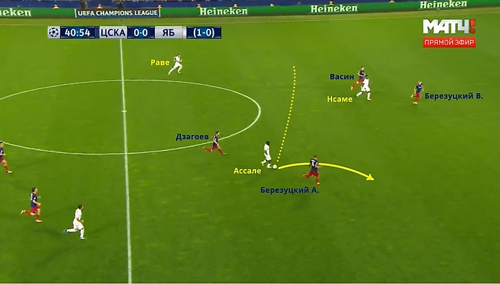 Хотя по идее брать опеку фулбеков на себя в данной расстановке должны были именно вингеры, а крайние защитники страховать партнёра. Стоит так же отметить, что многократно при вводе мяча Акинфеевым на своих нападающих, игроки Янг Бойз выигрывали борьбу за мяч, но подбор был за ЦСКА. Так и пришёл первый гол, к слову.