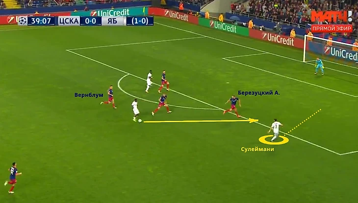 В первом случае пас нужно было отдать именно в момент, когда был сделан скриншот. Сулеймани на ходу и Алексей едва ли успел бы ему помешать, но Ассале отдал пас на 2 !!! секунды позже, когда серб уже тормознул, боясь попасть в офсайд и вся атака рухнула. При этом всех догнал Вернблум, которого и обокрал ранее ивуариец. Сербу пришлось с нуля разгоняться и тут, конечно, позиционно без скорости у него шансов не было.