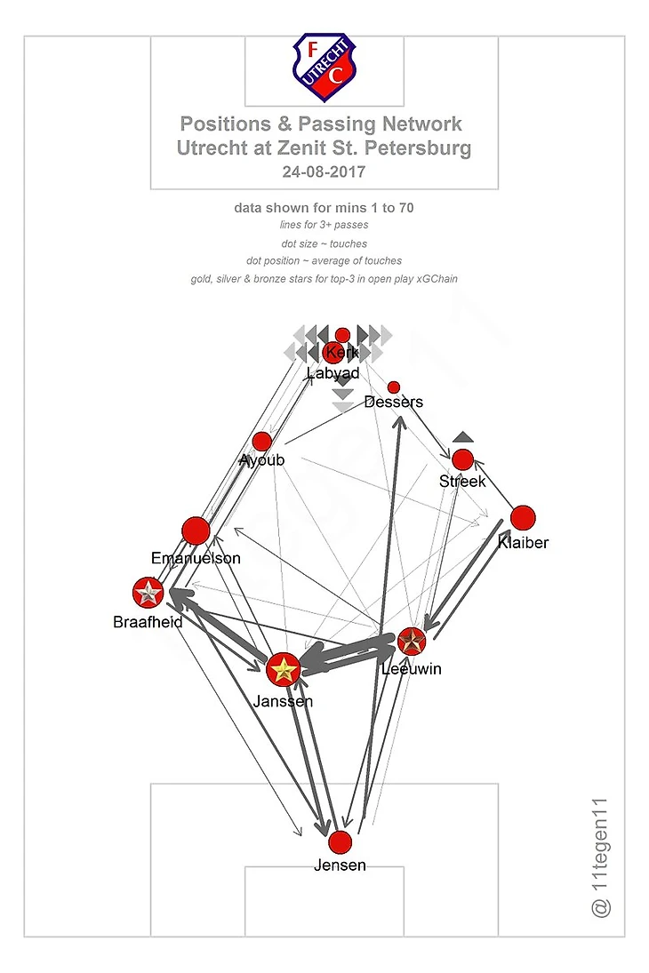 Карта передач Утрехта удивительна, играли без центра, но тен Хааг сознательно отдал центр поля как пешку, выстраивая build-up атак через клин.