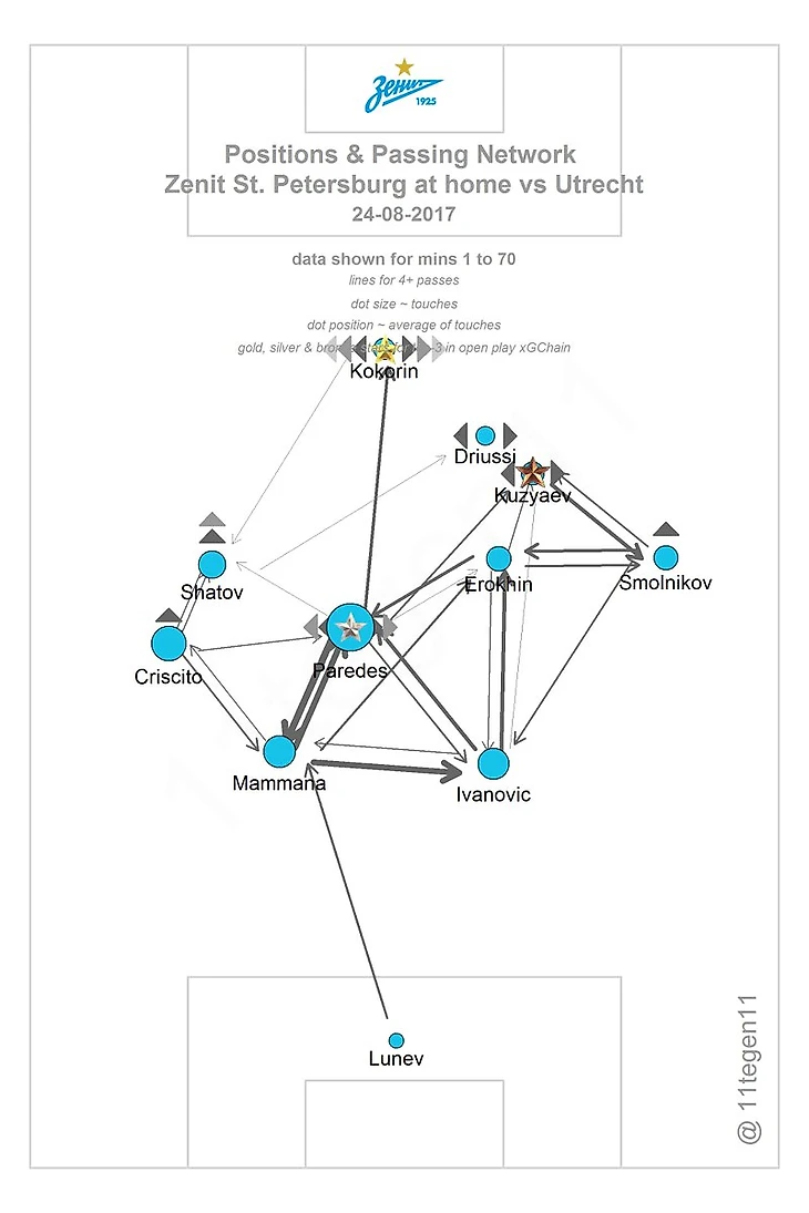 На нашей карте передач, линию от Паредеса к Кокорину можно смело сделать золотой, это главное оружие, которое создавало остроту. Визуализация игры Шатова не показательна, Олег выдал неплохой матч, даже без поддержки кавалерии в лице Кузяева и Ерохина, которые действовали больше справа, но к сожалению Олег по- прежнему не готов играть 90 минут, по медицинским причинам, проблема неврологического характера сохраняется, мышцы спазмируют раньше чем у здорового футболиста. К сожалению на карте не отображен вышедший Полоз, который провел почти столько же игрового времени, его проходы по флангу нашли бы явное отображение на карте.