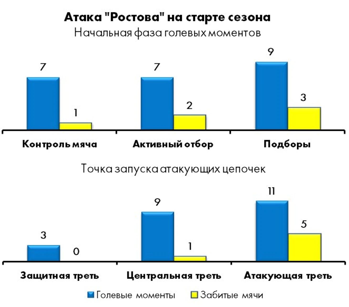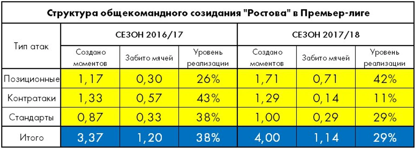 Как и в прошлом сезоне, главным источником креатива для дончан является коллективный прессинг. Непосредственно после отборов, перехватов и подборов «Ростов» создал почти 70% (16 из 23) голевых моментов с «игры» и забил 5 мячей из 8, причем в большинстве случаев атакующие цепочки стартовали уже в финальной трети поля.