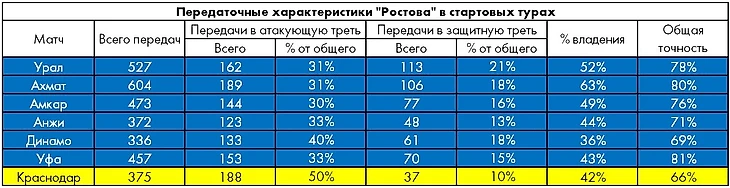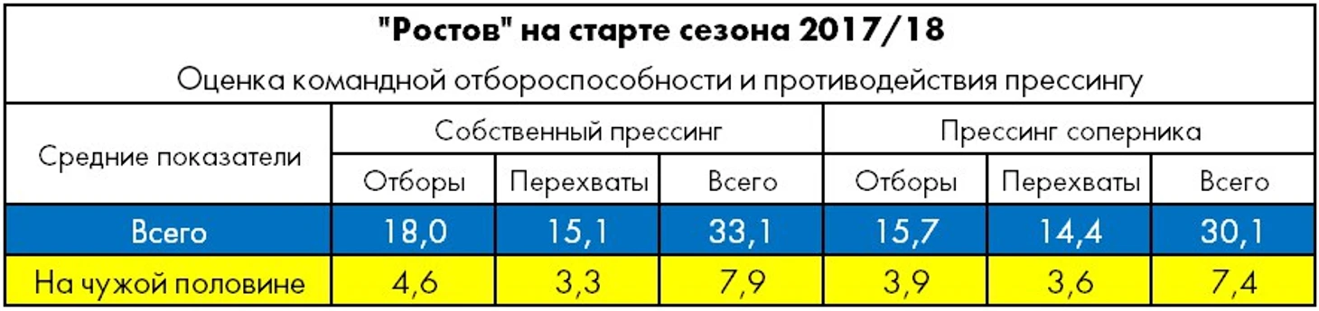 В стартовых турах ростовчане в среднем совершали 7,9 отборов и перехватов на чужой половине поля, но и на своей теряли мяч примерно с той же частотой – 7,4.