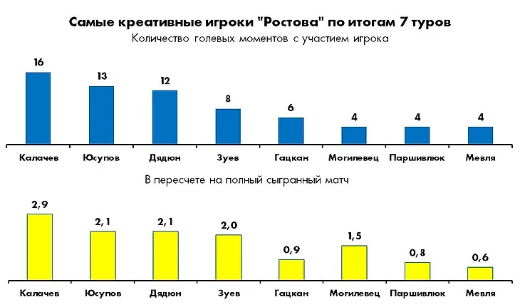 Впрочем, от ветерана «Ростова» исходит далеко не только «стандартная» опасность, потому как именно Калачев является самым креативным игроком команды на старте сезона.