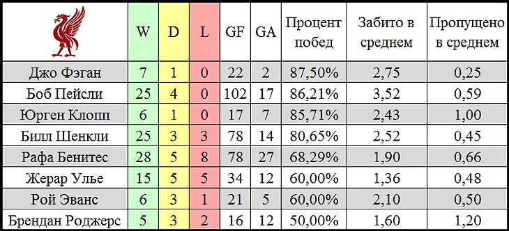 В таблицу не вошли Грэм Сунесс, Кенни Далглиш и Рой Ходжсон, так как при них было сыграно мало матчей. Стоит отметить серьезное превосходство Клоппа над Роджерсом и преимущество по сравнению с Улье и Бенитесом, которые, тем не менее, имеют в своем активе по одному еврокубку каждый. Также нельзя не обратить внимание на Боба Пейсли с его впечатляющими 29 матчами без поражений.