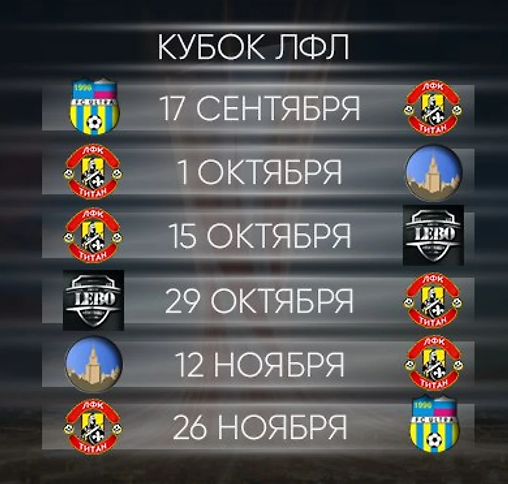 Также стало известно расписание матчей «Титана» на групповом этапе Кубка ЛФЛ. Для «чёрно-зелёных» групповой этап начнётся 17-го сентября, когда они в гостях сыграют с «Ультрой», а завершится 26-го ноября на родном «Сетунь Парке».