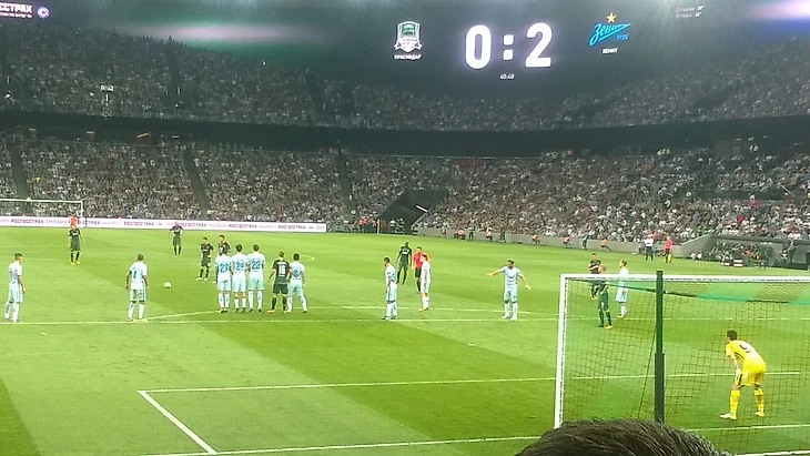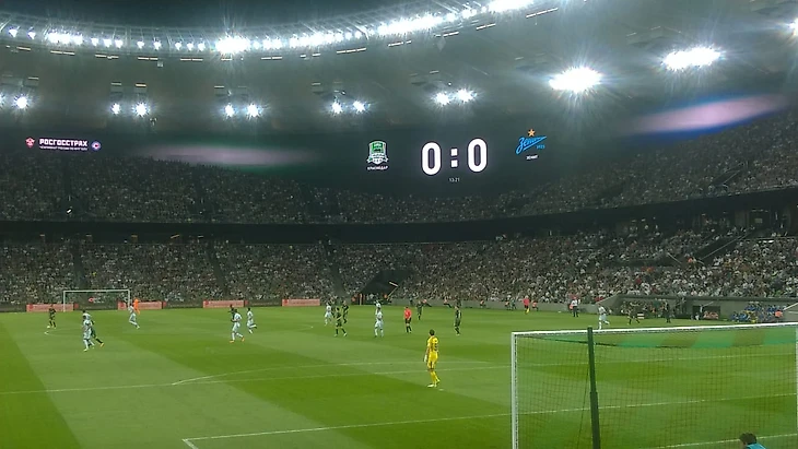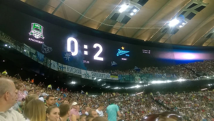 Краснодар хотел всех удивить видео на весь экран. Мощная, даже интересная идея. Да такая, что целых 2 минуты болельщики Краснодара пытались болеть за свою команду. Я было даже на секунду подумала, что у них это получится, но через ещё несколько секунд 33 тыс человек сдулись. Настала гробовая тишина. И тут начал зажигать наш питерский Вираж. Как и положено, по стадиону разнесся гимн Зенита.