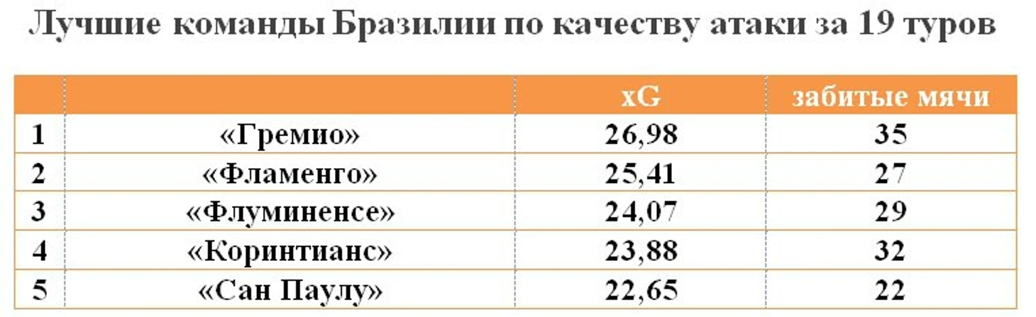 К концу августа «Гремио» сыграл 21 матч, после 19 команда Ренато опережала всех конкурентов и по общему xG, и по количеству голов.