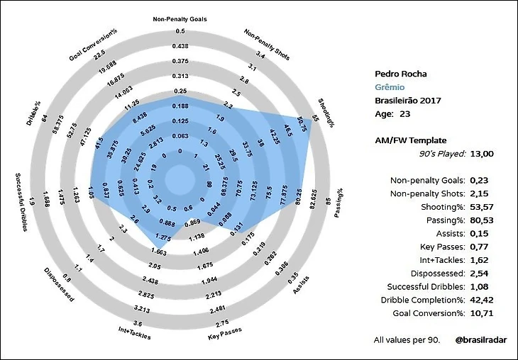 Пас – нелучшее качество нового спартаковского бразильца, но 1,5 передачи в штрафную за матч он отдает. В чемпионате Бразилии на счету Роши только 2 голевые передачи, но всего за сезон Педро 11 раз ассистировал партнерам. Чаще в «Гремио» результативных пасов не отдавал никто.