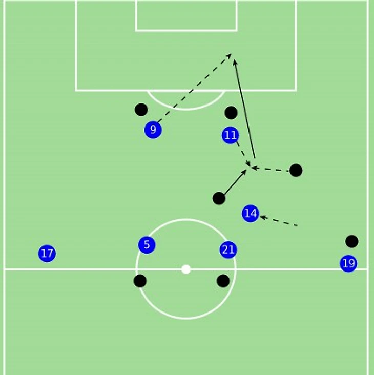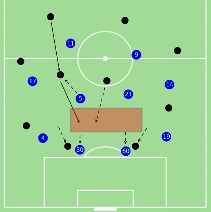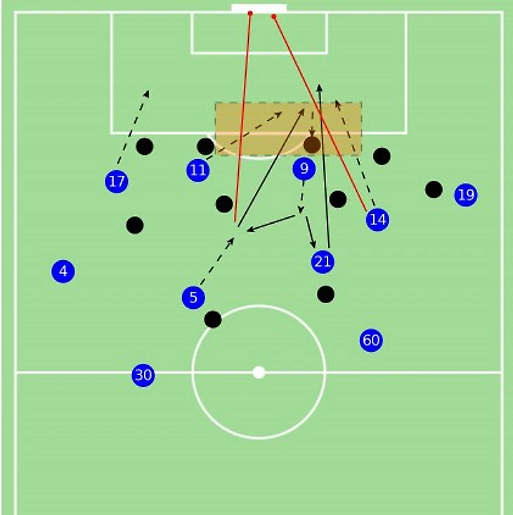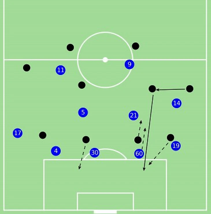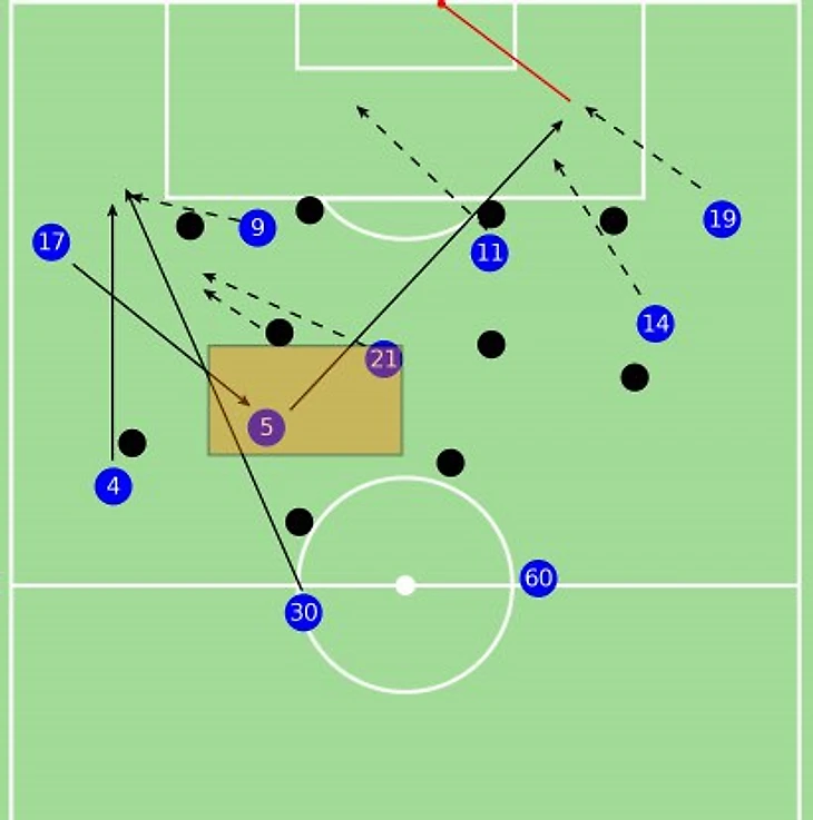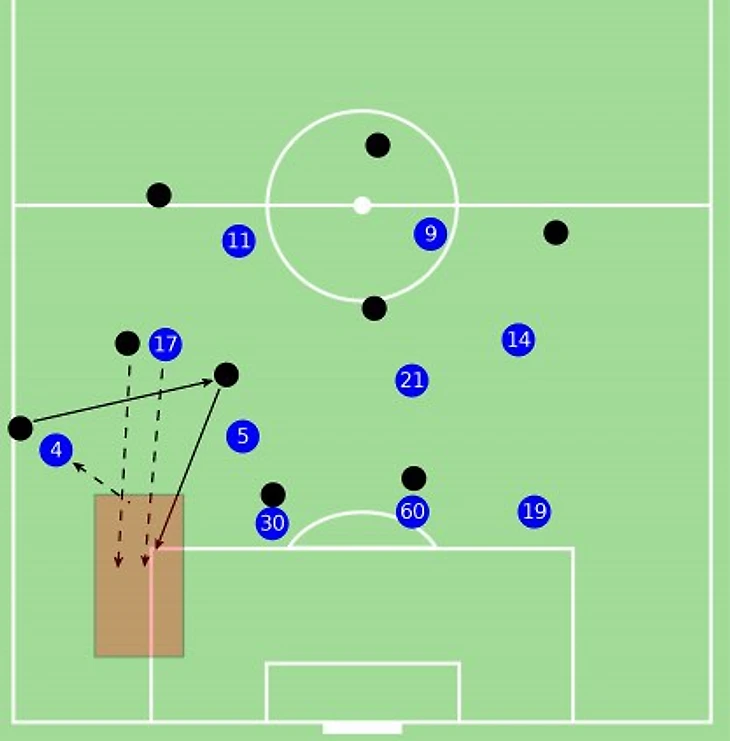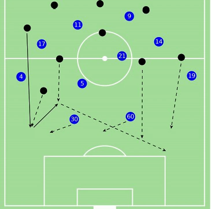 Высокая линия обороны создает возможности для передач за спину защитникам в контригре. Более уязвима оборона при адресации мяча в полуфланги. В зонах крайних защитников можно разыгрывать динамичные комбинации с выводом мяча за спину обороне. В позиционной защите у команды возникают сложности контроля пространства между линиями. Опорники уводятся на фланги, что позволяет отыгрывать их передачей. Защитники используют плотную персональную опеку. Перспективно акцентироваться на их уводах с позиции для создания горизонтальных разрывов и использовать создавшиеся каналы для резких врываний из глубины.