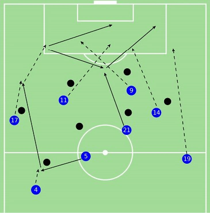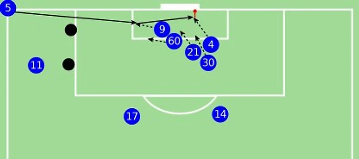 Основной исполнитель Паредес, но возможен прямой удар от Кришито (левша). От Паредеса стоит ожидать удара со всех позиций. Возможно расположение игроков в стенке, которые до удара "выдавливают" из нее соперника, образуя свободное пространство. Также о прямом ударе может свидетельствовать отсутствие среди атакующих центральных защитников. Атакующая группа идентична угловым. Возможно присутствие в ней Дриусси. Он не совершает открываний, а связывает одного из обороняющихся. Остальные атакующие располагаются в штрафной хаотично и в момент подачи делают резкие рывки, иногда скрещивая траектории. При фланговых навесах атакующие могут разделиться на 2 группы. Первая совершает рывки на ближную штангу, а вторая набегает от входа в штрафную.