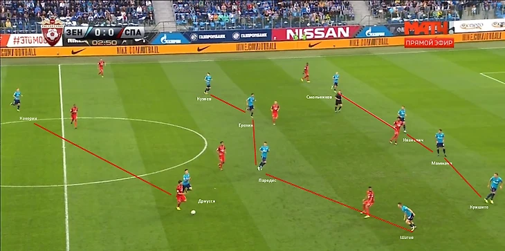 "Зенит" периодически использует высокий прессинг на половине поля соперника. Нападающие в момент овладевания сразу открываются в свободное пространство между защитниками соперника под проникающий пас. В результате такой атаки в матче со "Спартаком" был забит гол.