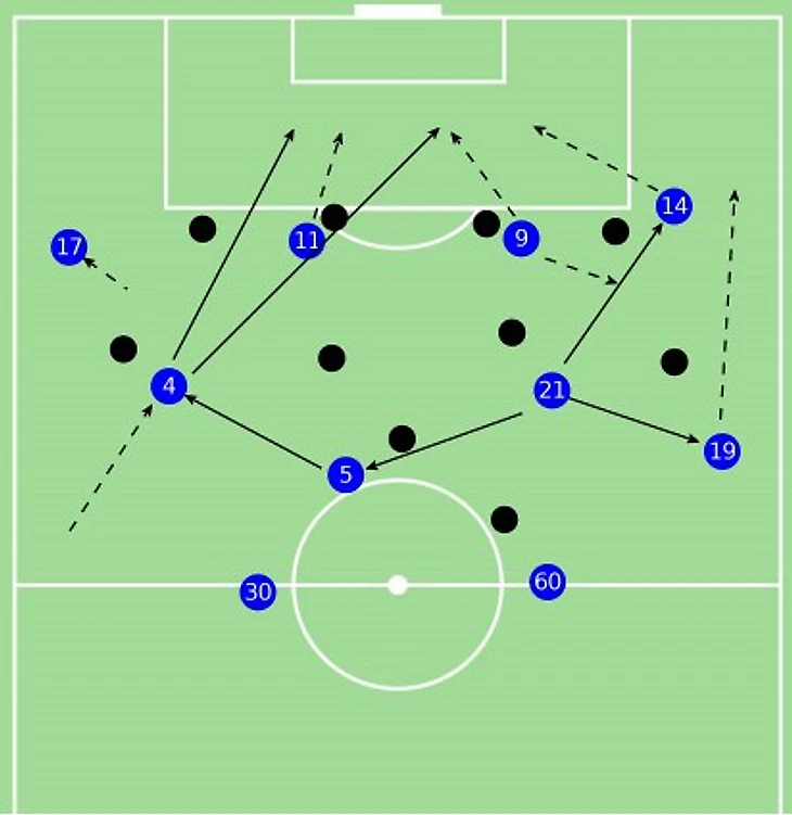 Другой вариант развития атаки - пролонгированные передачи на игрока, открывающегося в полуфланге. Рывок совершается футболистами атакующей группы. Часто применяется перевод мяча на противоположный фланг. При этом один из опорников смещается в активный квадрат. После создания на фланге большинства, следует перевод на игрока противоположного фланга. Чаще всего такие передачи исполняет Паредес.