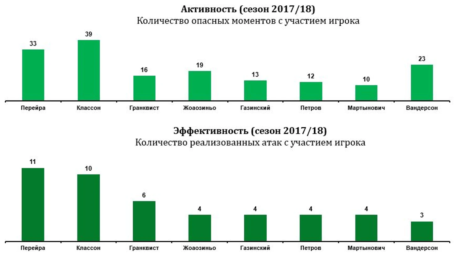 Остальные игроки группы атаки до них пока не дотягивают. Вандерсон много суетится, по количеству участий в потенциально голевых моментах он, в целом, неплох, но атаки с его участием имеют лишь 13% эффективности и только три увенчались голом. Достаточно часто в результативных атаках участвует и Гранквист, ставший штатным пенальтистом, однако атакующие задумки не должны быть его главной обязанностью. Полезно, особенно в части предголевых передач (лучший в команде), действует Жоаозиньо, хотя стабильности не хватает и ему. Ну и, конечно, не набрал пока кондиций Мамаев. Сколько ещё ему нужно времени, совершенно не понятно.