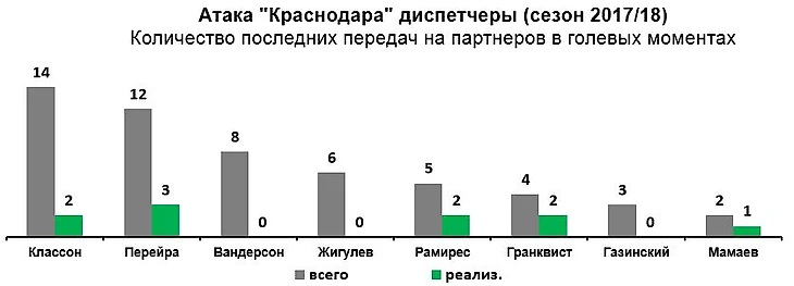 Классон – лучший в команде по последним передачам в опасных моментах. Отметим и появление в этом рейтинге относительно новых лиц. Как выяснилось, Жигулев, Рамирес, а также новый Вандерсон - парни с добротным пасом, другое дело, что с завершением атаки у команды были проблемы, по разным причинам отсутствовали все центральные нападающие. Возвращение кондиций к Фёдору Смолову может открыть для этих игроков группы атаки совершенно новые горизонты.