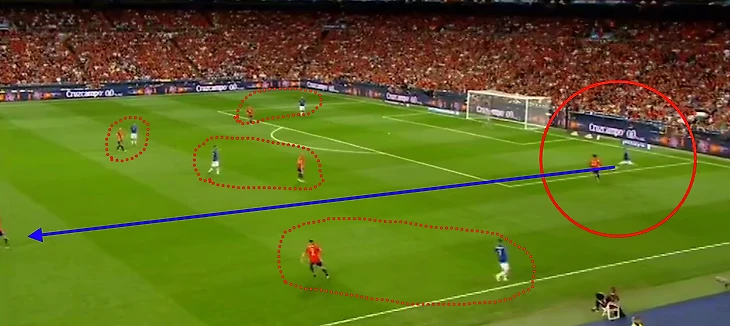 Италия атаковала исключительно правым флангом: все опасные моменты пришли оттуда. Спинаццола больше думал, как сдержать активного Асенсио и гиперактивного Карвахаля. Отсюда, вариантов в атаке у итальянцев было значительно меньше, так как единственным вариантом продолжения атакующих действий стали передачи на правый фланг.