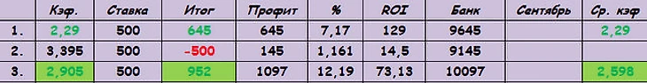 Сентябрь - 3ст, +2 =0 -1, +1097р, +12,19%, ROI=73,13%. Банк =10097р.