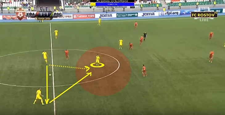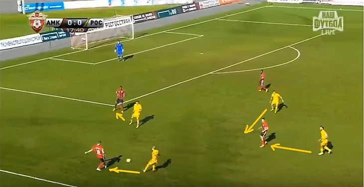 При переходе в атаку Ростов редко торопится доставить мяч своим нападающим. Чаще всего игроки перекатывают поперёк поля, открывая свободные зоны, подключая своих опорников, чтобы начать атаку через какой-либо из флангов, или чтобы найти Калачева.