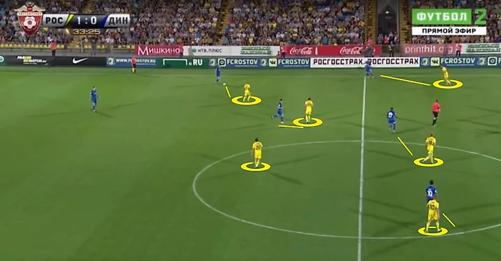 При потере мяча ростовчане не отходят глубоко в защиту, как это часто было у Бердыева, встречая оппонента, чаще всего, не выше центрального круга. Сейчас атакующий треугольник тут же включается в прессинг. Даже при коротком вводе мяча голкипером тройка нападения сразу старается прессинговать. При этом опорники действуют максимально подвижно, нейтрализуя свободные зоны, поднимаясь так же высоко в зону атакующих полузащитников для агрессивного прессинга, а линия защиты поднимается за ними, чтобы минимизировать расстояния между линиями.