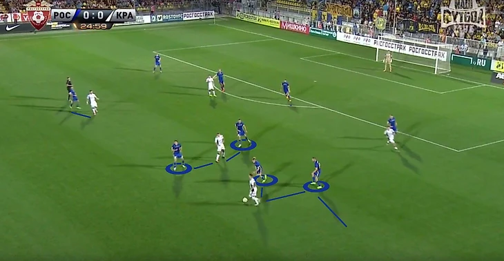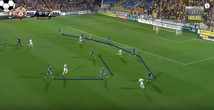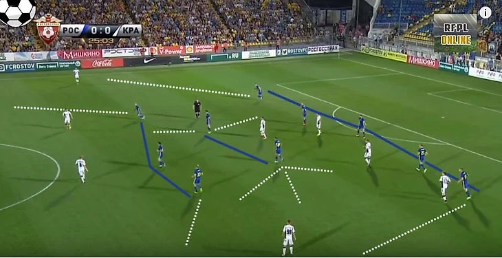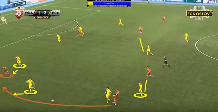 Такую защиту можно вскрыть только за счет скорости передач, обостряющих передач, большого движения либо быстрых переводов на фланг. Обязательно быстрых, а не бесполезных зависух, которые использует 90% команд РФПЛ. Т.к. главная идея максимально быстро использовать освободившуюся зону на противоположном фланге, за счет стягивания игроков. Ростовчане очень мобильны на поле и максимально быстро заполняют свободные зоны, страхуя партнёров. Но это опять же скорость и риск. Ростов заставляет соперника рисковать и дейстовать неординарно.