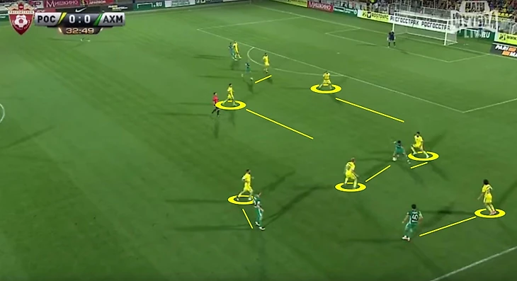 Команда создаёт очень высокую плотность в центре поля, заставляя соперника сваливаться на фланг либо отдавать голкиперу для выноса. Это в свою очередь заставляет либо играть длинно вперёд, либо пытаться вскрывать этот самый фланг, который мало того, что ростовчане изрядно насыщают, так ещё и имеет ограничение в виде боковой линии. Таким образом менее техничные и быстрые команды загоняют себя в капкан, в котором очень тяжело созидать и больше приходится выгрызать мяч, либо возвращая его обратно, либо навешивая в штрафную. Главная задача - заставить соперника действовать под постоянным давлением, на минимально свободных участках поля.
