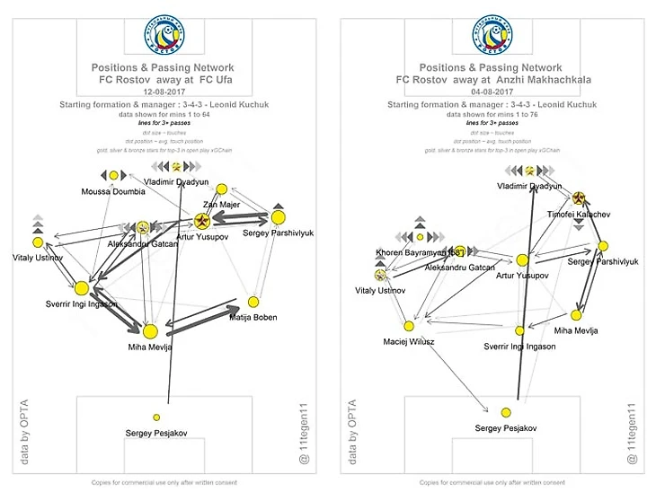 Разнообразие атак Ростова говорит о том, что в каждом матче команда знает слабые места соперника и прощупывает их на поле в действии, а затем постоянно давит через них. Используя, несомненно, свои сильные качества. Так было с Краснодаром, когда Тимофей получал много пространства в средней зоне, в виду того, что высоко уходили Ристич и Жигулев. Так использовался правый фланг Зенита. Так же использовался форвард и игра через фланги с Уфой, чтобы проходить насыщенную центральную линию Уфы. Но, так или иначе, у команды есть два игрока, через которых эти атаки обретают вектор.