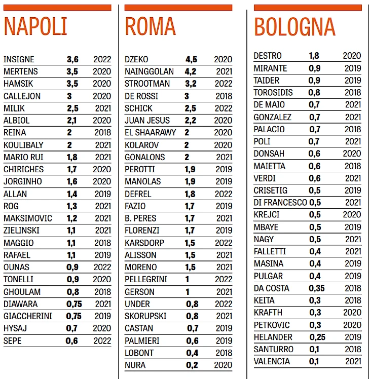 Цифры рядом с фамилией игрока означают его чистую базовую зарплату в миллионах евро (нетто) без учета премий, бонусов и налогов. Цифра после зарплаты – срок действия контракта.