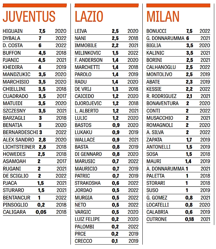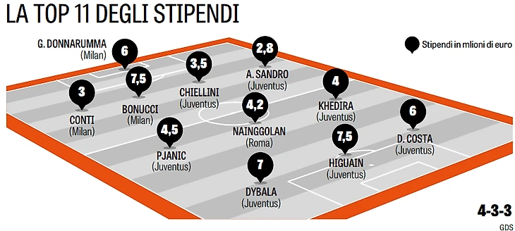 Сборная самых высокооплачиваемых игроков серии А: 1 игрок «Ромы», 3 – «Милана» и 7 – «Ювентуса».