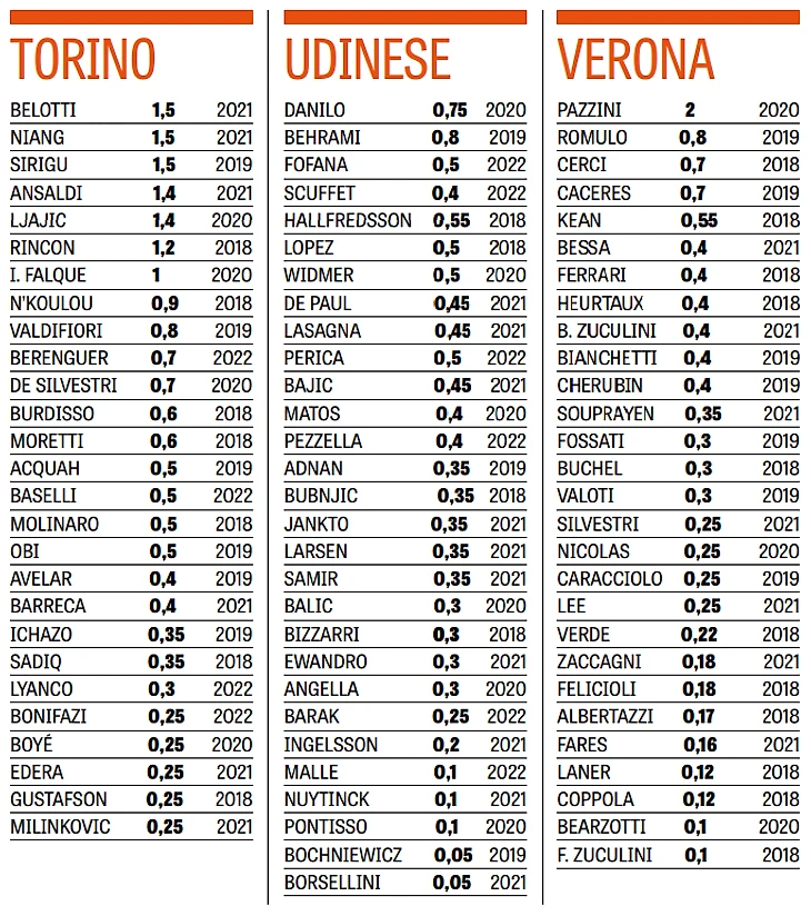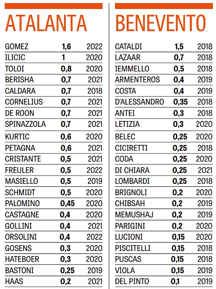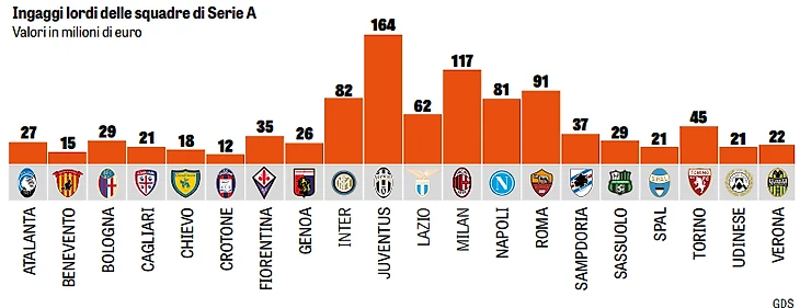 Цифры рядом с названием команды означают общий фонд зарплаты в миллионах евро (лордо) с учетом базовых зарплат, премий, бонусов и налогов, которые выплачивает клуб.