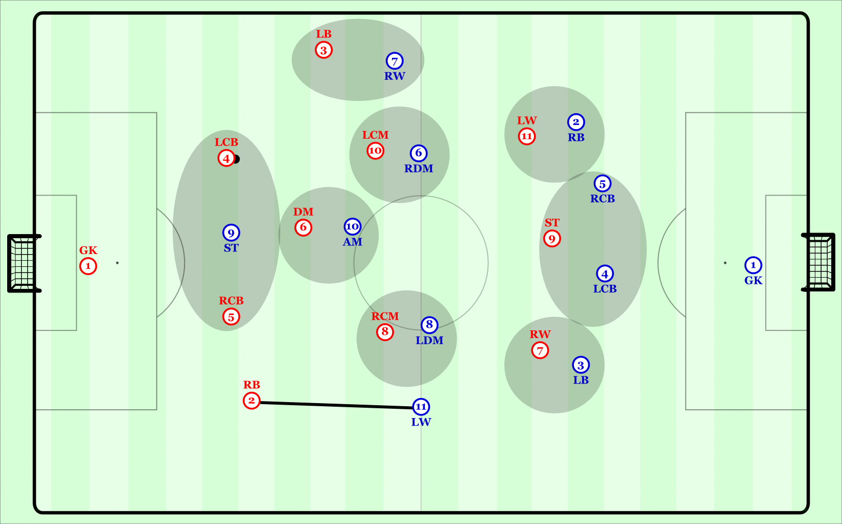 Однако, напрямую это работает не всегда хорошо. Когда соперник потерял возможность опекать одного из игроков, он начнёт использовать cover shadows, чтобы у дриблёра не было вариантов для передачи. Поэтому вам всегда нужно искать альтернативные маршруты для продолжения атаки.