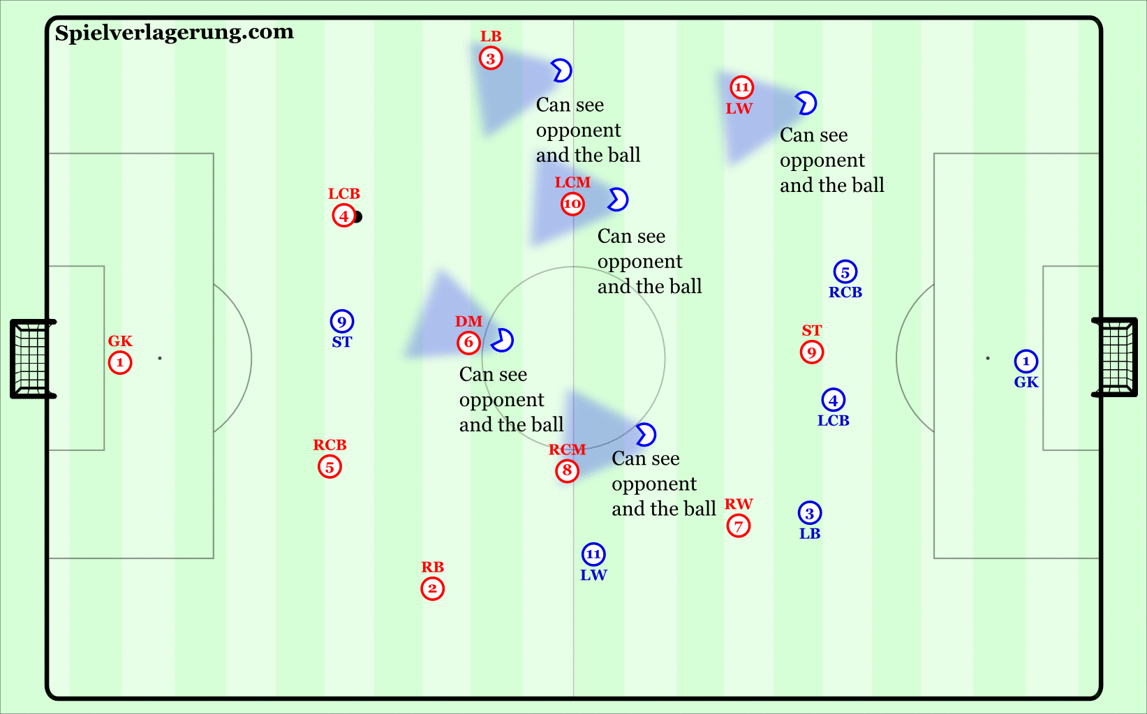 На самом деле, обороная с персональной маркировкой – это единственная ситуация, в которой выдвинутые игроки атаки оказываются под меньшим давлением. Обороняющиеся всегда играют выше, потому что им нужно сохранять дистанцию до соперника, а их взгляд направлен или в сторону мяча или в сторону опекаемого.