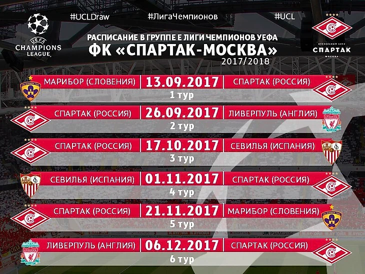 Свой стартовый матч на групповом этапе Лиги Чемпионов красно-белые проводят против потенциального аутсайдера группы «Марибора» - а это реальный шанс, уже в первом туре, завоевать три очка. Следующие два поединка «Спартак» проводит дома против фаворитов группы. На «Открытие Арене» легко не будет никому. Москвичей погонят вперёд собственные болельщики. При удачном стечении обстоятельств в этих трёх поединках можно набирать шесть, а то и семь очков, а это уже, как минимум еврокубковая весна. А если всё будет складываться по оптимистичному сценарию, то победа над «Марибором» дома, с учётом осечек конкурентов, в матчах между собой, вполне может позволить «Спартаку» занять второе место в группе.