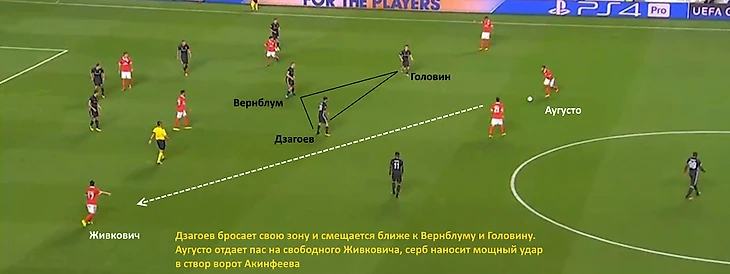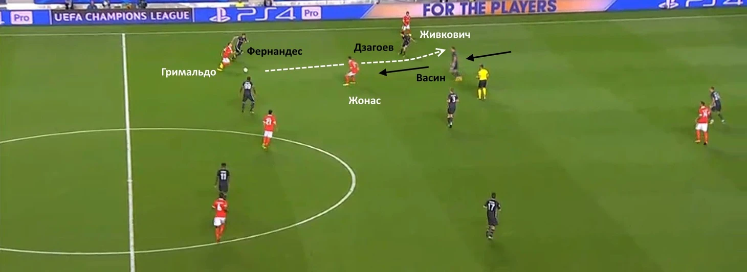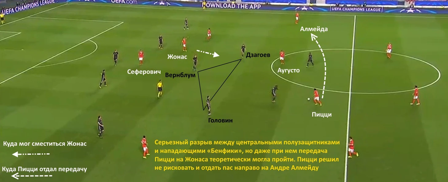 Матча с ЦСКА в Португалии ждали с опасениями – как оказалось, не напрасно. Армейцы ожидаемо отдали хозяевам мяч, но Дзагоев и Головин редко помогали Оланаре и Витиньо в прессинге (хотя и со стороны форвардов он был весьма условным). В целом тройка хавбеков команды Гончаренко при обороне располагалась гораздо ниже, чем в играх премьер-лиги. Похоже, что «Бенфика» оказалась к этому не совсем готова – позиционные атаки лиссабонцев были медленными, хозяева очень плохо двигались без мяча. Иногда даже при больших разрывах между средней линией и атакой «Бенфика» доставляла мяч к штрафной Акинфеева, но португальцы редко шли на риск, предпочитая избегать потерь в середине поля.