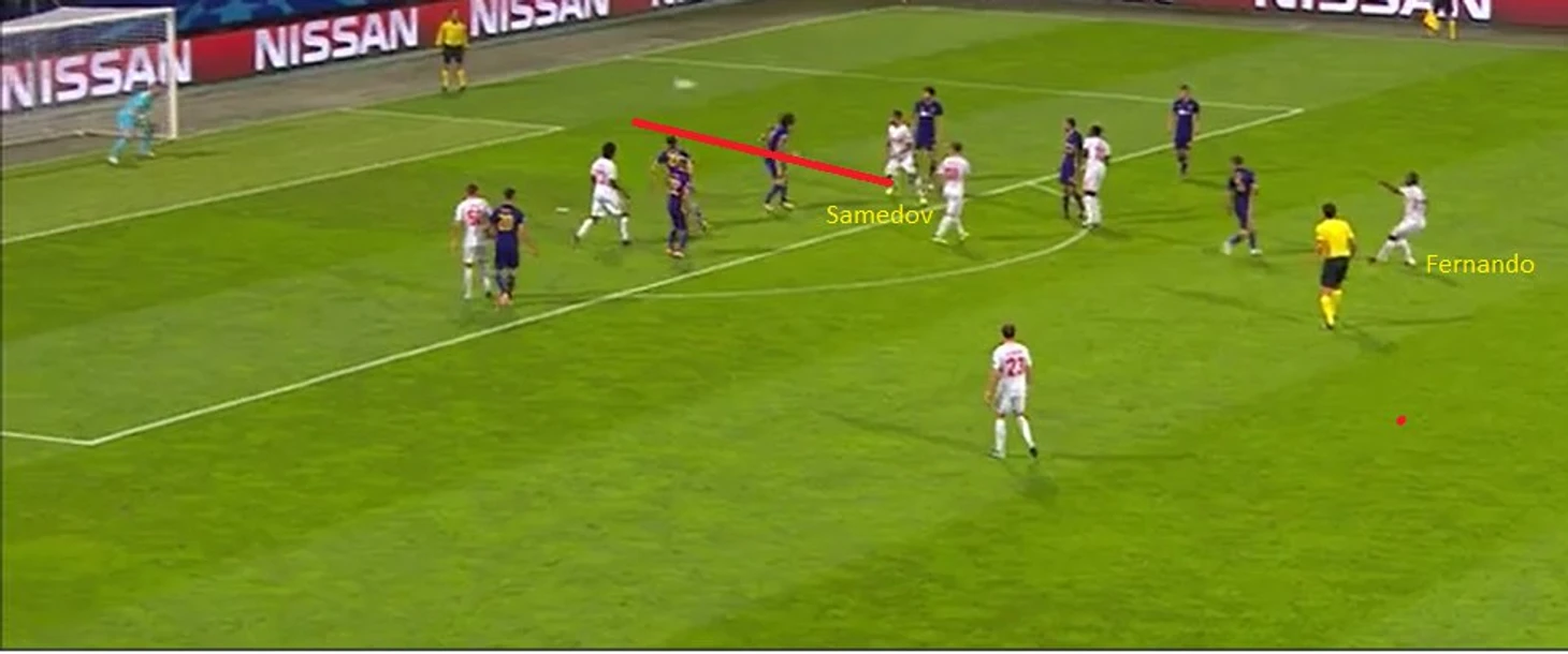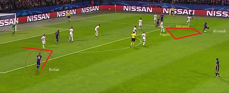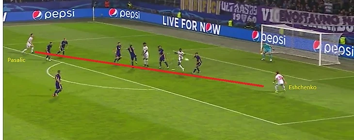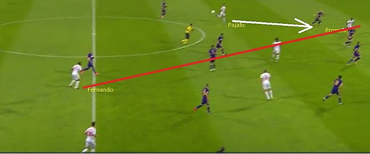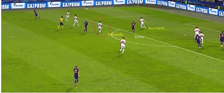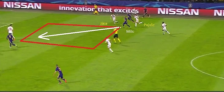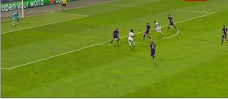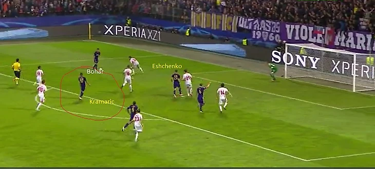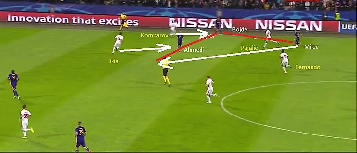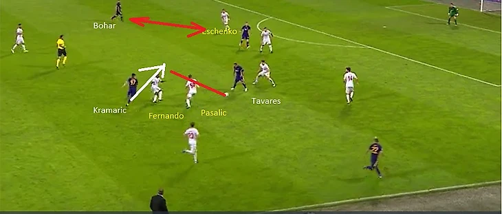 На первой же минуте матча такая атака закончилась опасным ударом по воротам Реброва. Milic со своей половины начал атаку: отдал передачу на Bojde тот в одно касание на третьего – Ahmedi, который просто пропускает мяч на забегающего Milic, легко оторвавшегося от Пашалича. Ошибся хорват в этом эпизоде.