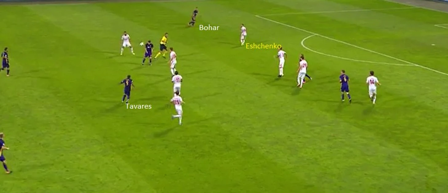 Спустя несколько минут все повторилось: опять Ещенко оставил пространство для Bohar, на которого вырезал передачу Tavares. Bohar убирает Ещенко на замахе но в этот раз не попадает в створ.