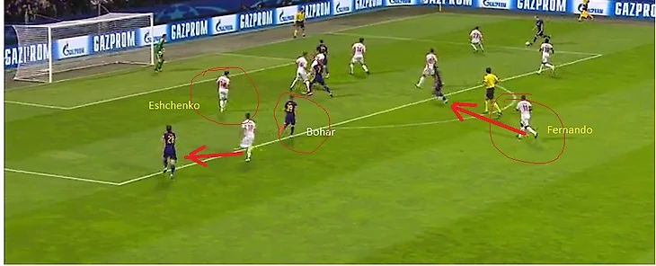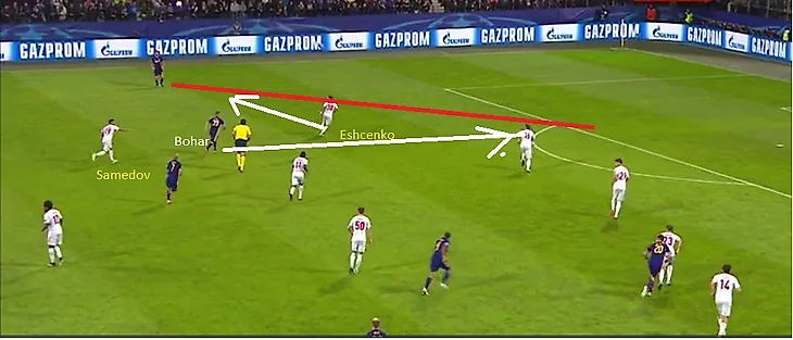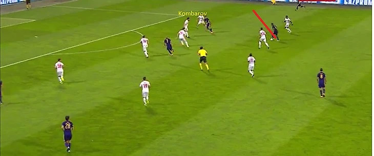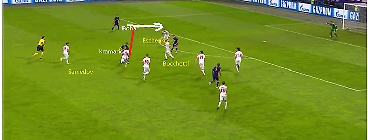 В первом тайме стало заметно, что Спартак при позиционной обороне допускает много ошибок. Посмотрите момент с ударом Bohar. В начальной стадии Tovares увидел свободную на правом краю, вопрос где Комбаров? Во второй стадии Ещенко на противоположном фланге никого не держит в штрафной, а за его спиной спокойно занимает позицию для удара Bohar. Предупредительный выстрел прозвучал в первом тайме.