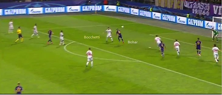 На 61 минуте марибор организовывает позицонную атаку, перевод на другой фланг от Tavares на Kabha, Bohar ускоряется совершенно один в штрафную (Разрыв между Самедовым и Ещенко), в штрафной Bohar встречал Боккети. Kabha делает навес в штрафную и итальянец проигрывает борьбу, занимая неправильную позицию при подачи и Boharбьет головой в штангу. Второй предупредительный выстрел.