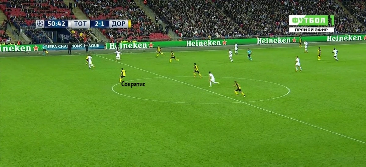 Основные действия разворачивались на флангах, центр команды друг другу здорово перекрыли. У «Тоттенхэма» 21% атак через центр, у «Боруссии» – 22%. При этом кошмарная игра обороны гостей, несогласованные действия при создании офсайда, ошибки Бюрки дважды пропустившего в ближний угол, стоили «Боруссии» результата.