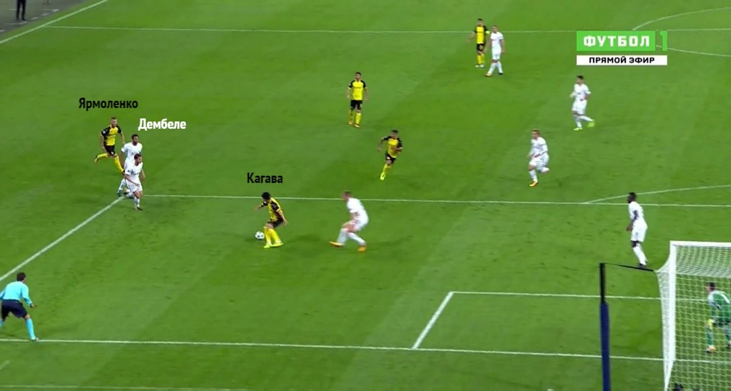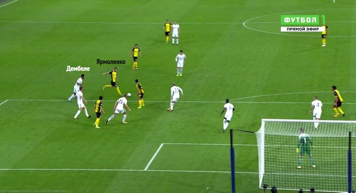 Дембеле перекрывал движение Ярмоленко к центру, но после того, как украинец отдал пас на Кагаву, Муса выключился из эпизода и смотрел на мяч.