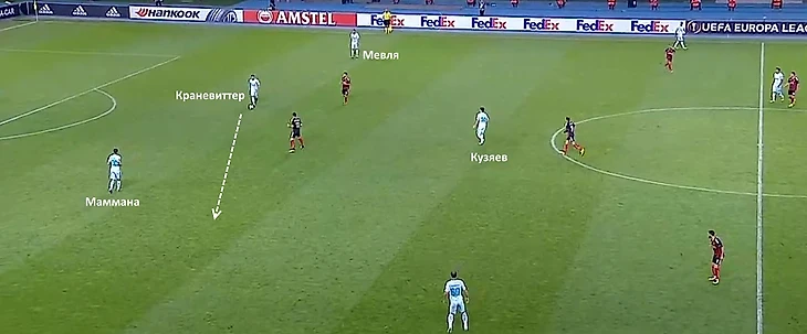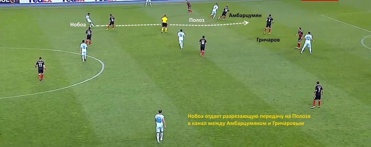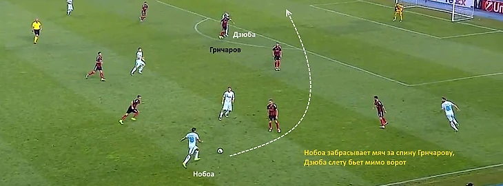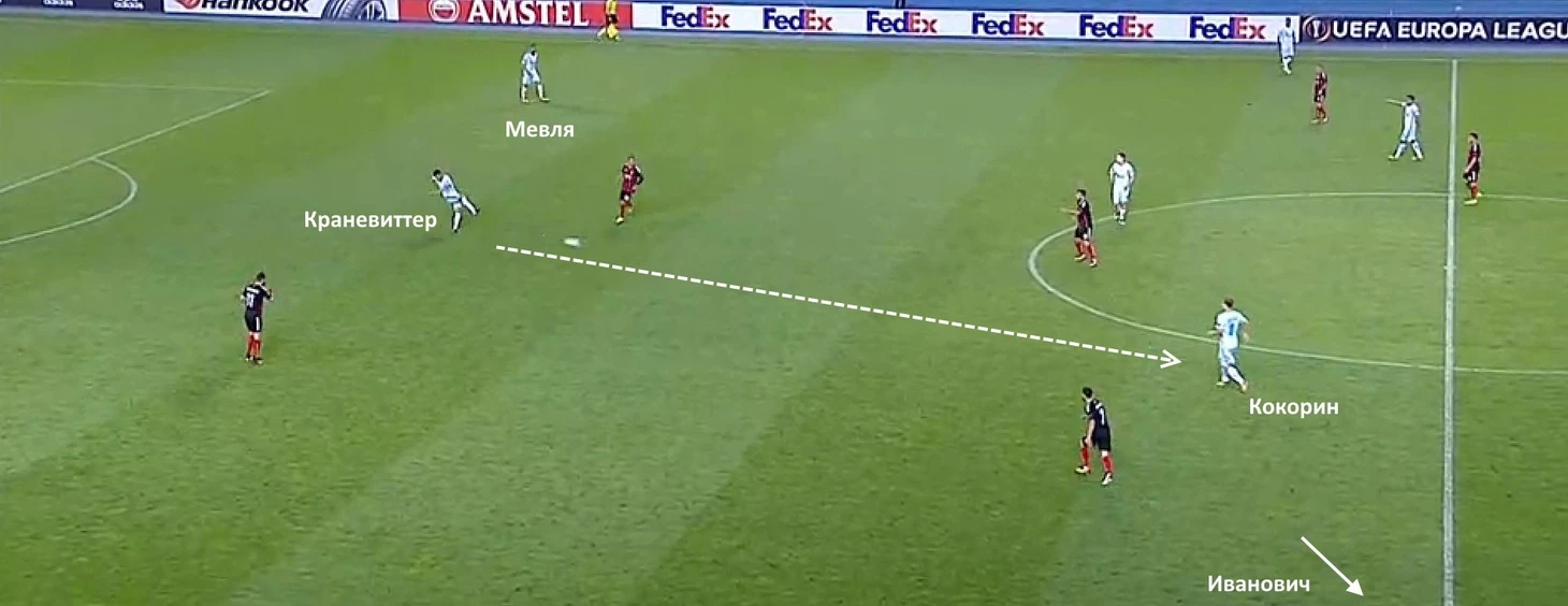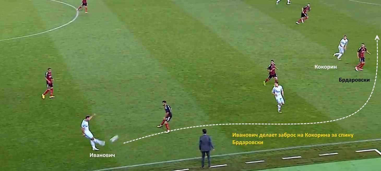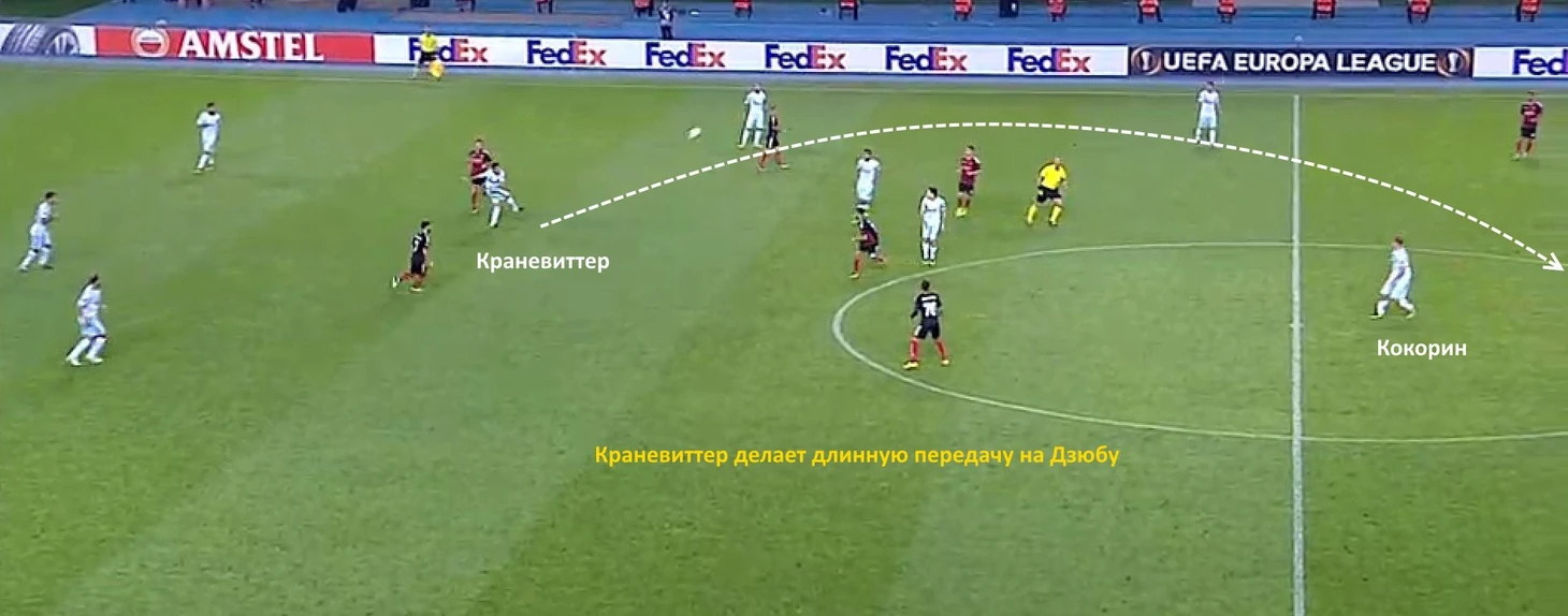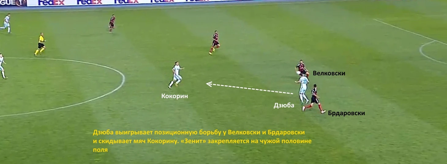 Благодаря наличию в составе Дзюбы, «Зенит» мог рассчитывать не только на передачи в свободные зоны в расчете на скорость Полоза и Кокорина, но и на длинные передачи на центрального нападающего.
