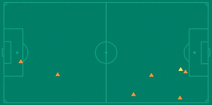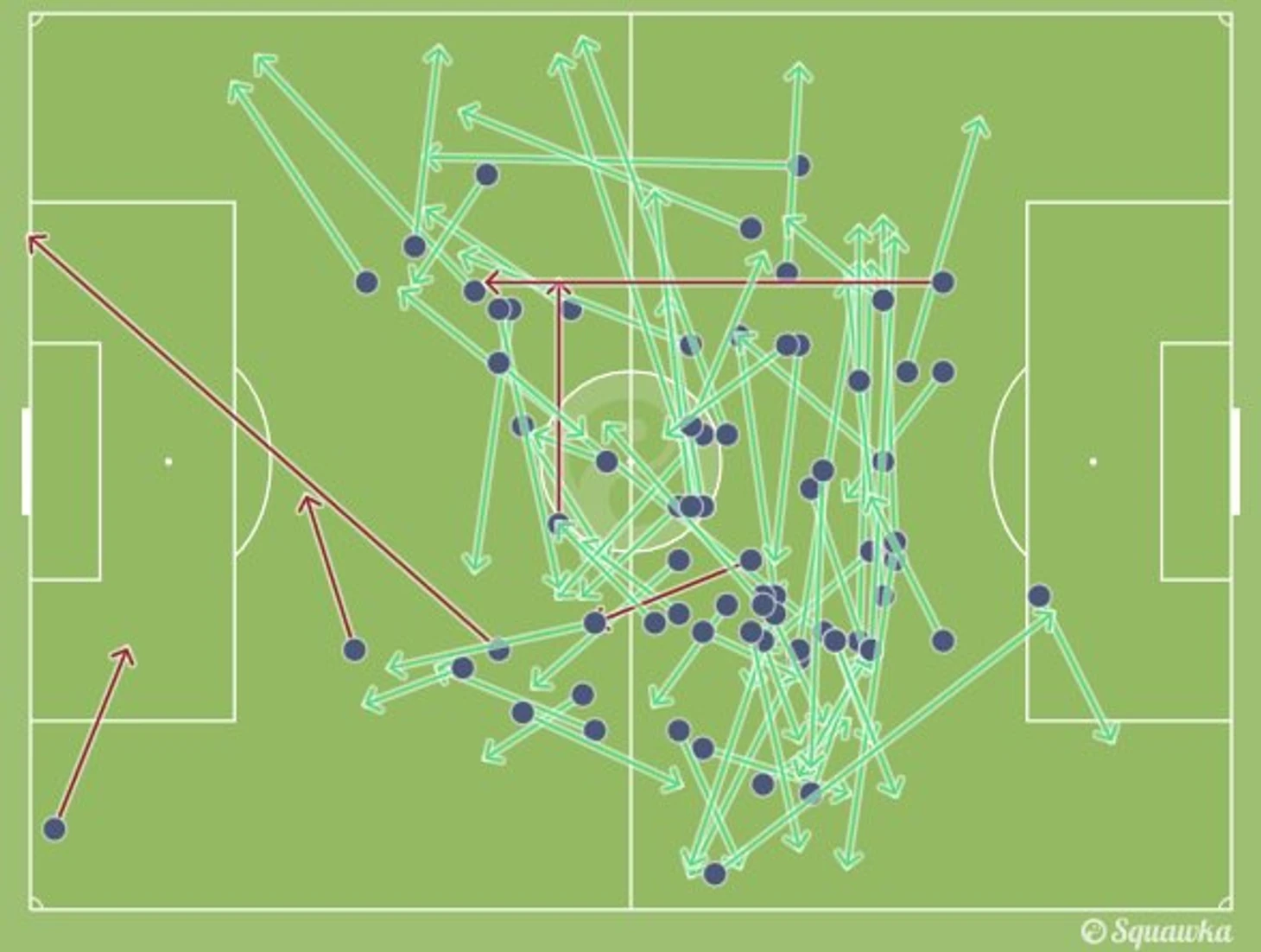 Карта передач Краневиттера. Всего – 69 передач (больше всех в обеих командах), 65 точных. 6% брака при зенитовских 11%.